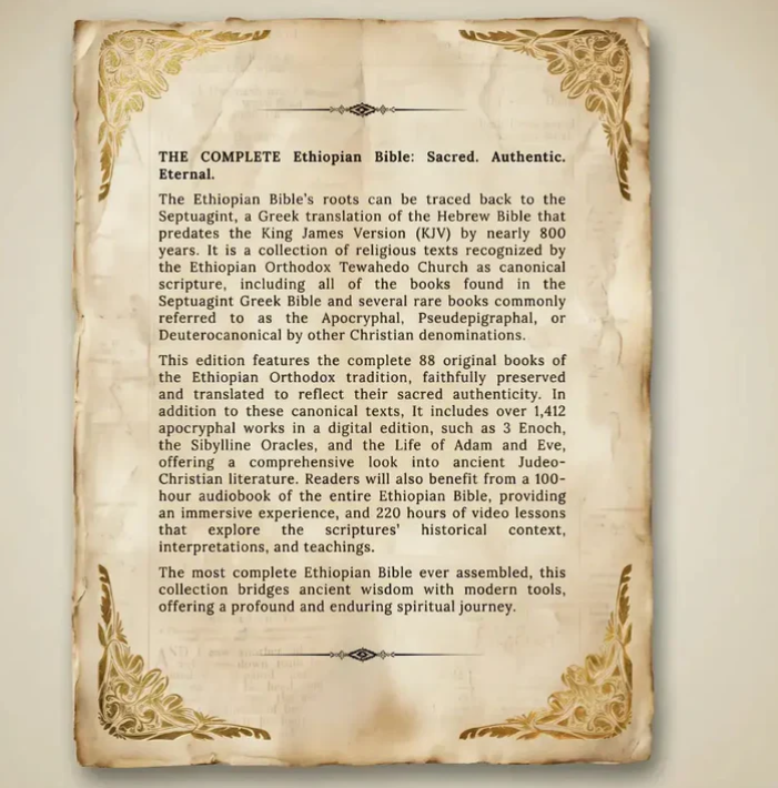The only English Bible that includes the full Ethiopian canonwith missing apocrypha like Enoch and Jubilees plus over fourteen hundred ancient texts not found in any standard KJV edition